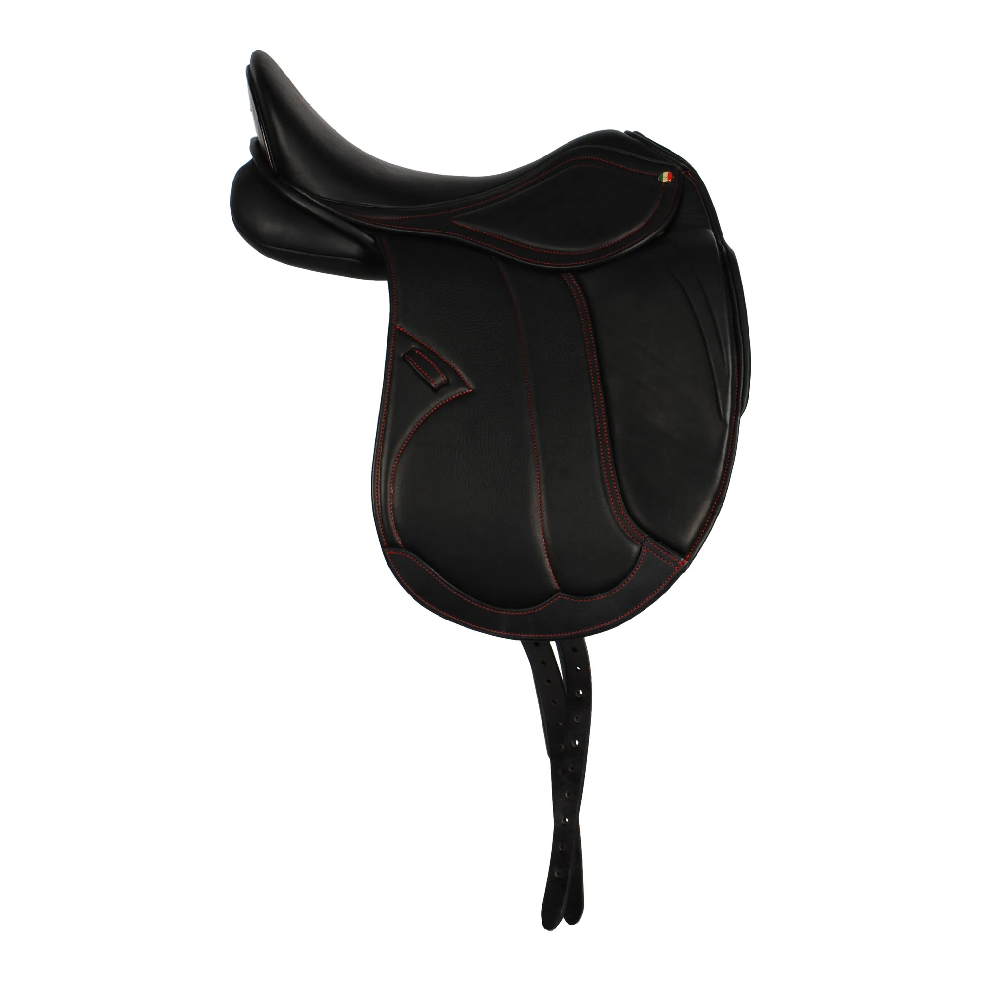 Fijn liggend en zittend dressuurzadel van super zacht leer met rood sierstiksel.