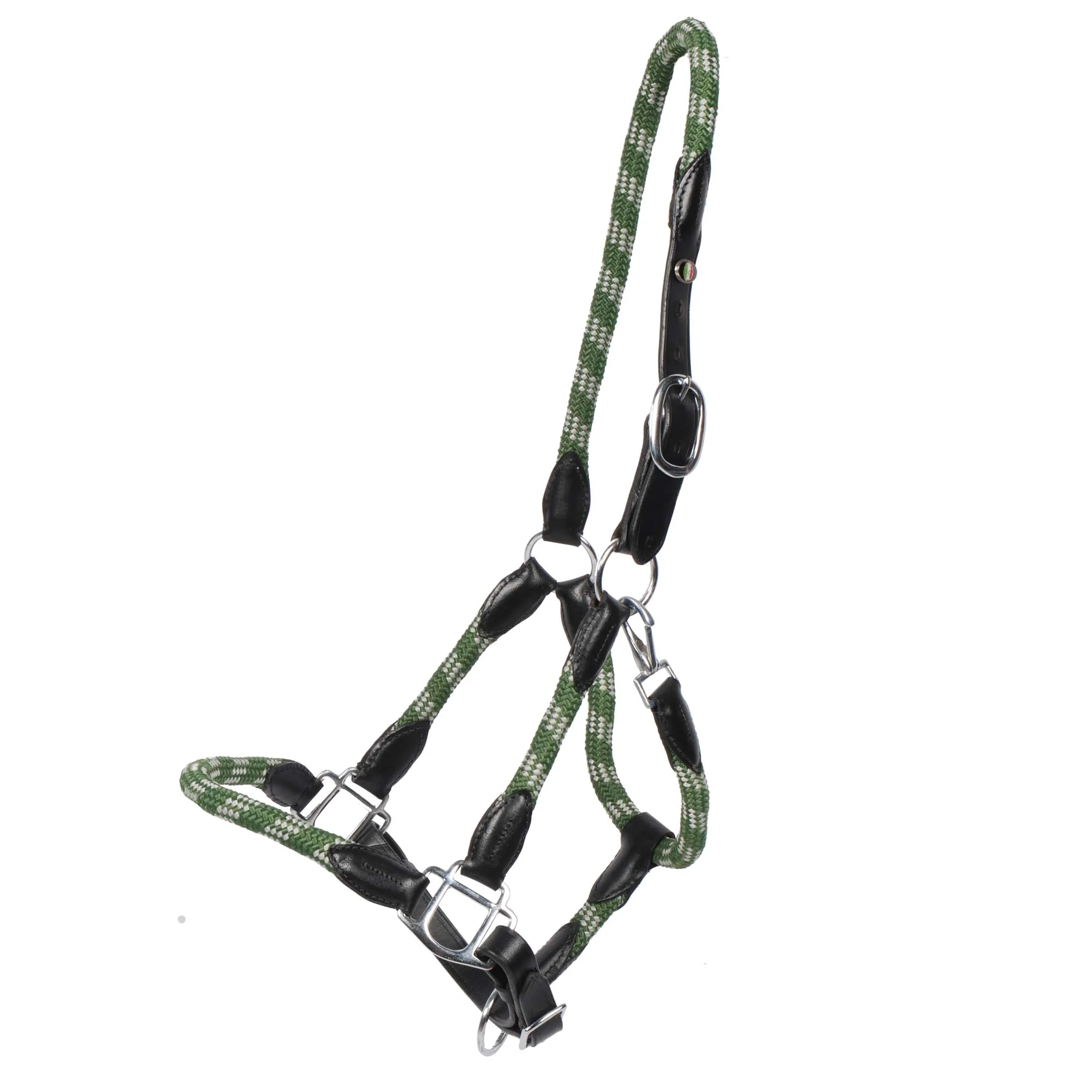 Prachtig halster van gewoven koord met leer afgewerkt.